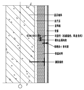 由背筋增強裝飾板、連接件、金屬構架、保溫材料、膨脹錨栓、嵌縫材料和密封膠等材料構成,安裝在建筑外墻外表面不承擔主體結構荷載與作用的構造總稱,簡稱背筋裝飾板外保溫系統。