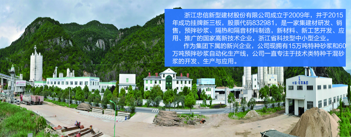 浙江忠信新型建材股份有限公司成立于2009年,并于2015年成功掛牌新三板,股票代碼832981,是一家集建材研發、銷售,預拌砂漿、隔熱和隔音材料制造,新材料、新工藝開發、應用、推廣的國家高新技術企業,浙江省科技型中小型企業。