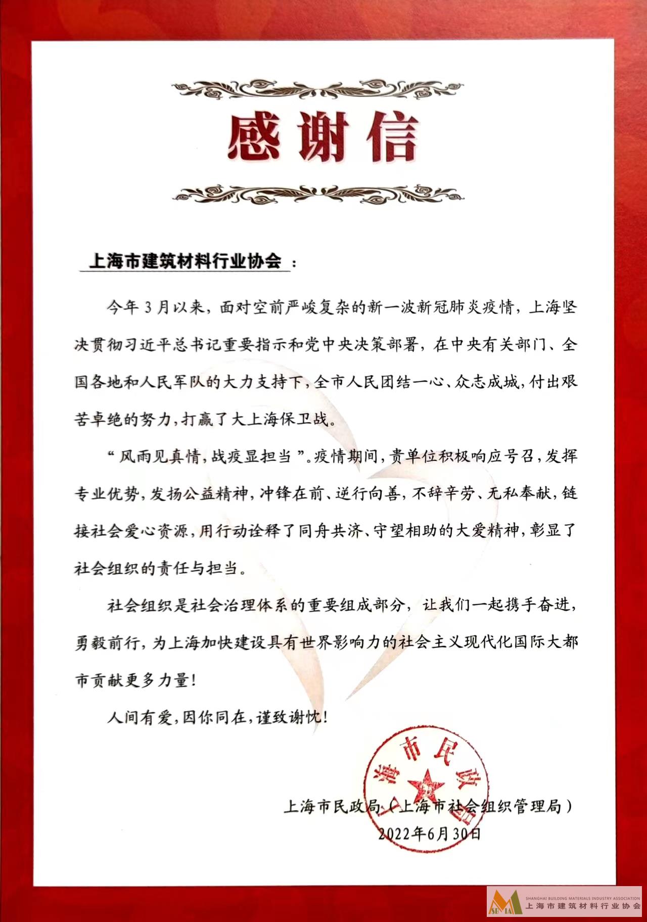 近日,協(xié)會(huì)收到上海市民政局(上海市社會(huì)組織管理局)發(fā)來(lái)的感謝信,對(duì)協(xié)會(huì)在疫情期間積極響應(yīng)號(hào)召,鏈接愛(ài)心資源,發(fā)動(dòng)會(huì)員單位捐贈(zèng)物資,爭(zhēng)做志愿者等工作表示感謝。